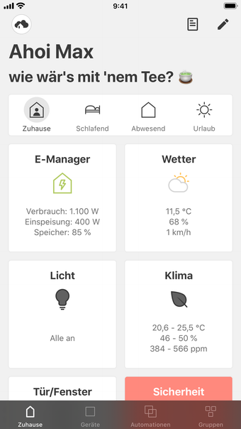 homee - Pfeiffer&May用に作られたアプリは、スマートフォンから自宅の包括的なリモートコントロールとして機能します。このアプリでは、アラームの監視、通知の受信、および安全かつローカルに測定値を表示することができます。開いているか閉じているかの窓、室温、照明の状態、湿度、CO2レベルなどを追跡することができます。アプリはすべての測定値、バッテリーステータス、およびデバイスの接続状態を表示します。Xtraスマートホームでは、Pfeiffer&Mayの専門知識により、スマートホーム製品の知的な統合が容易になります。